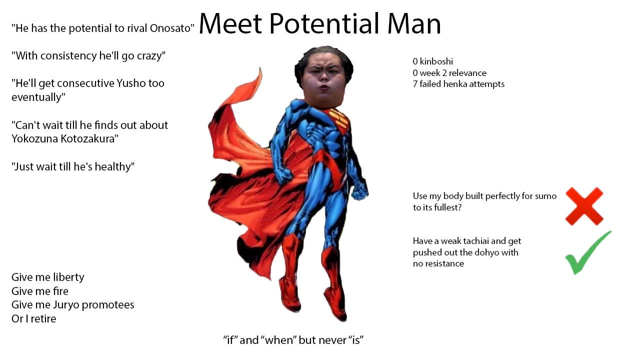 Having won 8 matches in July, even a Zensho Yusho - 15 wins, no losses - would be insufficient for promotion to Yokozuna. For things to go well and him to be on track to go up even higher he’ll need 13 wins which is more or less saying he’ll have to be competing for the championship in the final days. There’s honestly not too much to say about Kotozakura. He finds himself in a similar position to Hoshoryu before his rope run to the top; firmly ensconced at the Ozeki position and just needing to put it together two tournaments in a row. Why Kotozakura seems to have trouble finding that consistency despite his terrific stature and solid all around game is the million dollar question. As I was writing this I couldn’t help but think of the “Potential Man” meme and so I made a version for Kotozakura. It’s meant to be more of a joke so don’t take it too seriously and hopefully in a year or two we can look back with a smile at how he finally put things together.